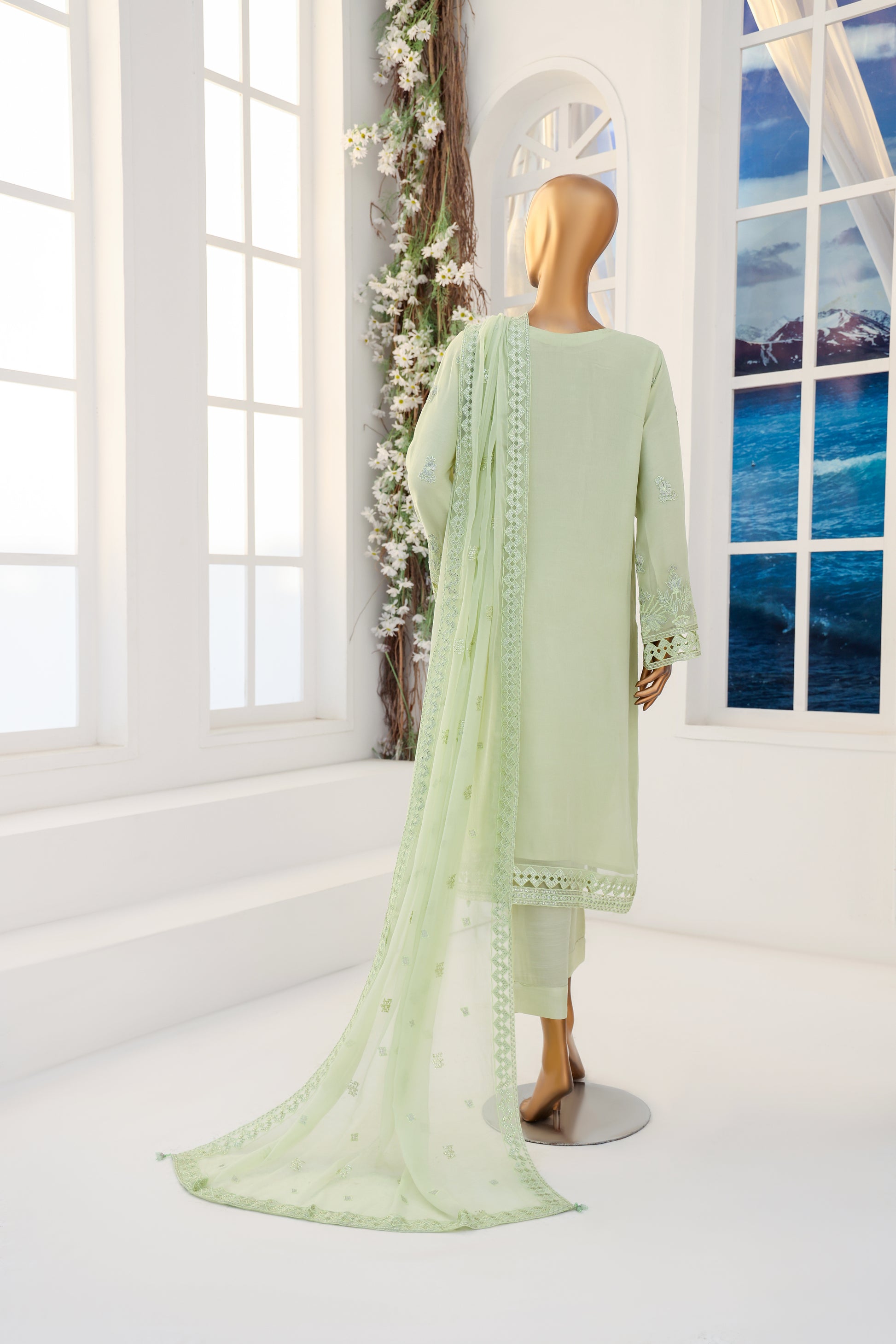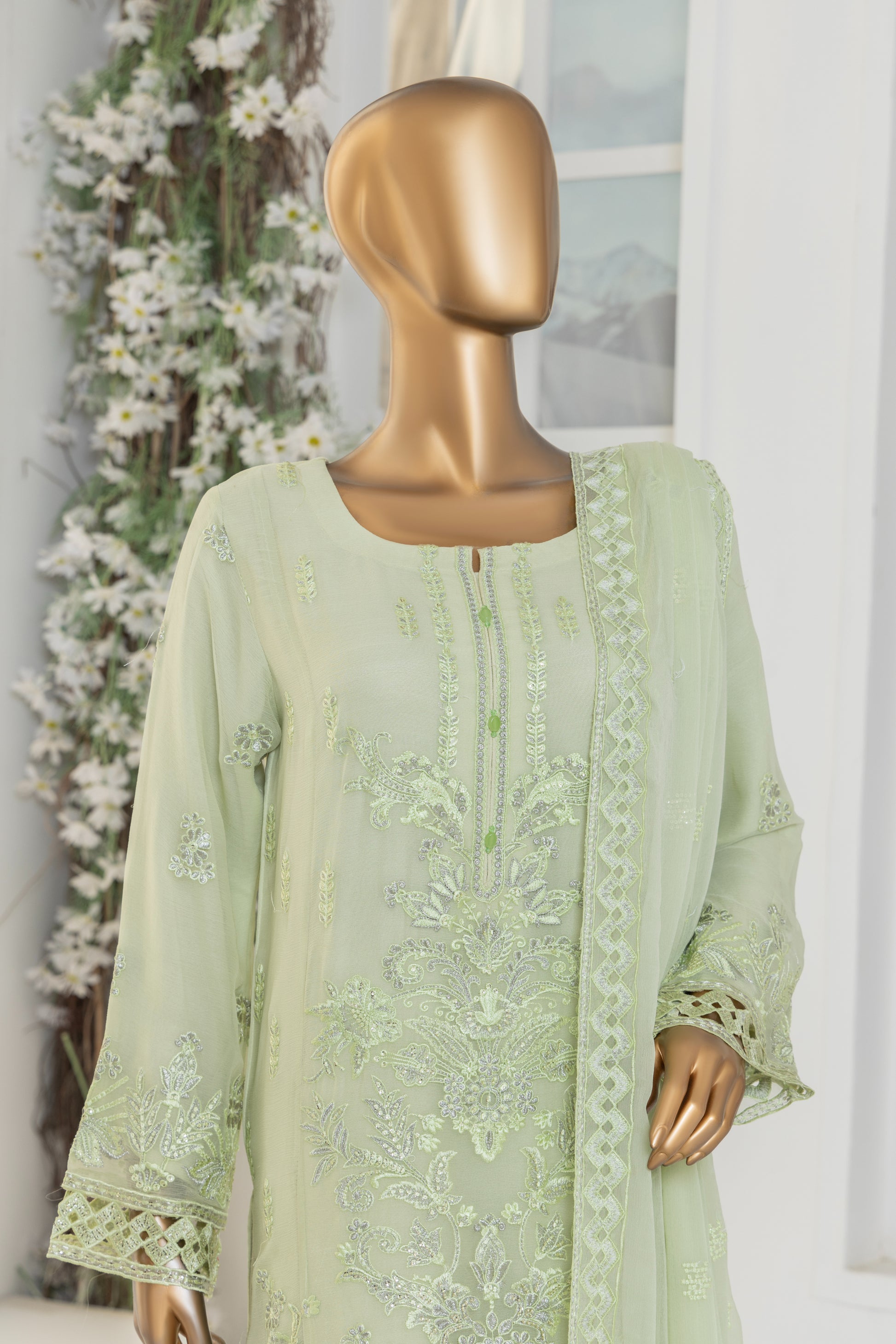 Dupatta: Embroidered Chiffon with 4-side Silk Dori Piping.