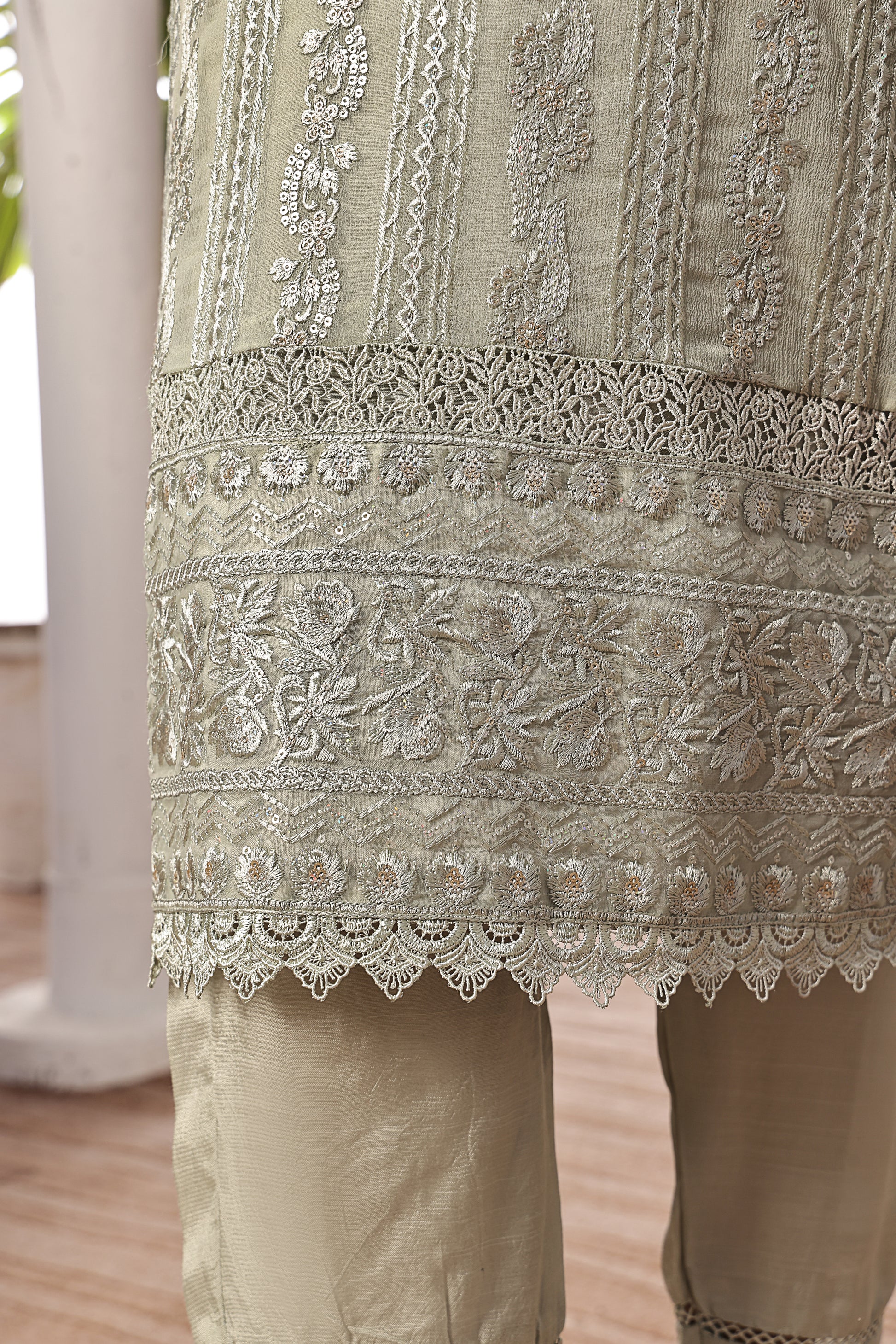 Shirt: Chiffon with Embroidery, Neck Handwork, and Lacework. Viscose inner for comfort.