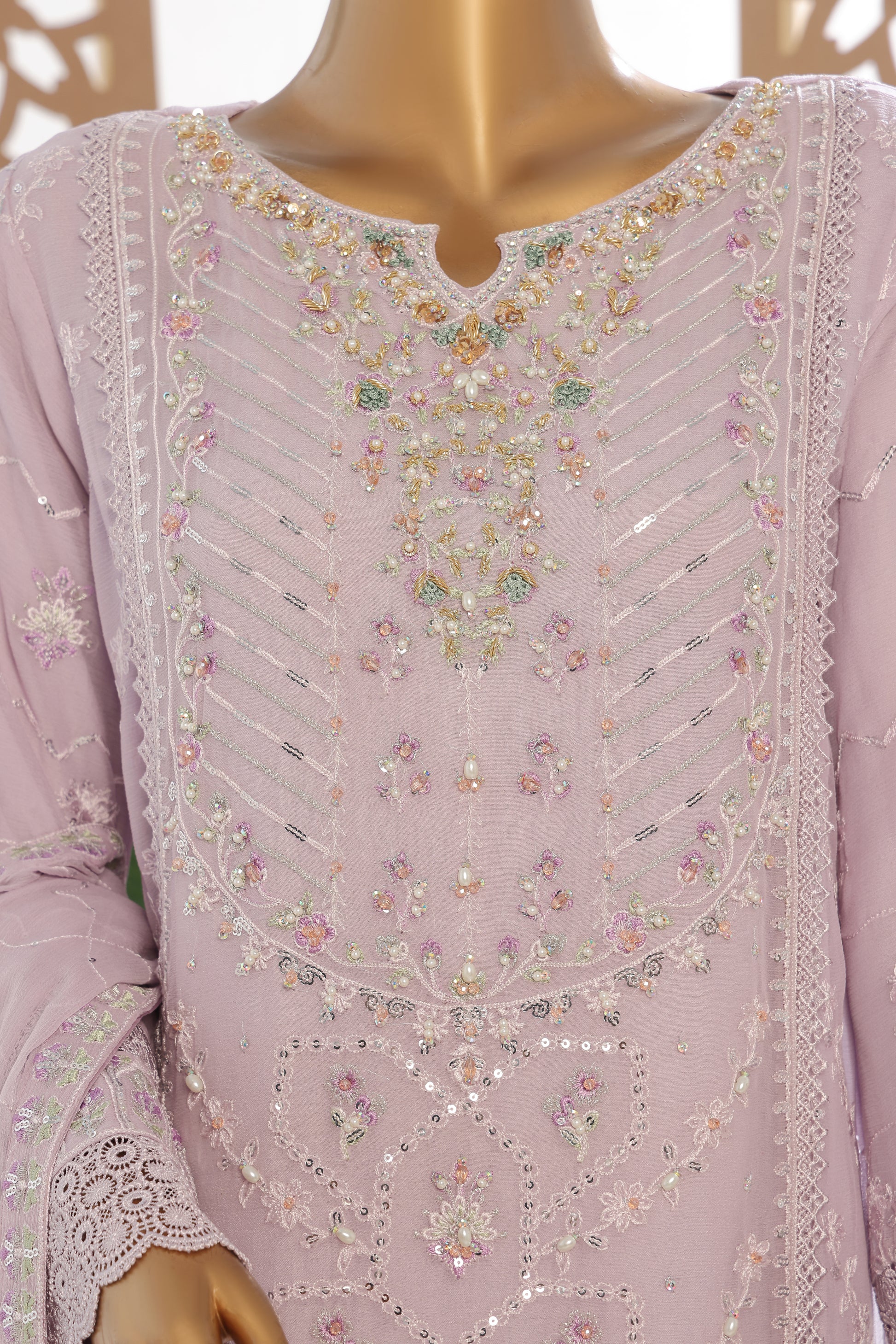 Shirt Chiffon Semi Stitched, handwork or laces, embroidered back with lace work, embroidered sleeves with laces.