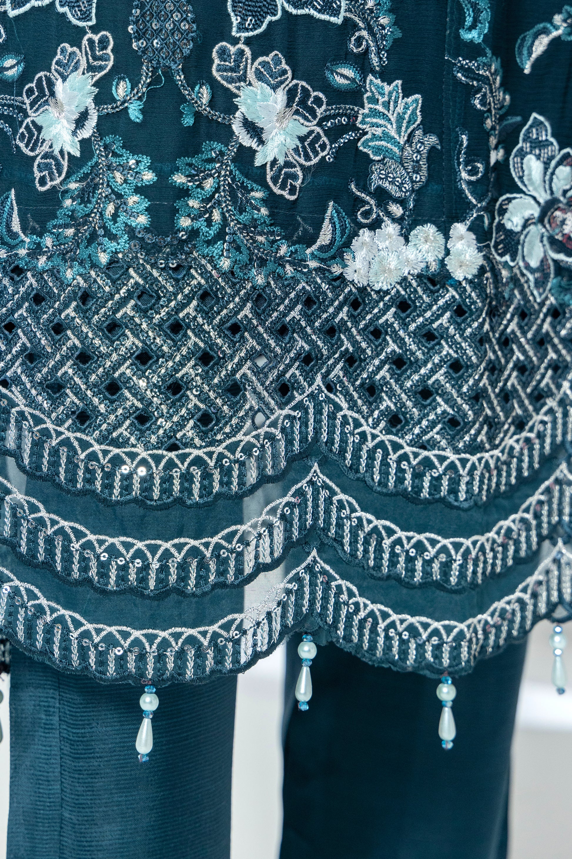 Dupatta: Embroidered Chiffon with 4-side Silk Dori Piping.