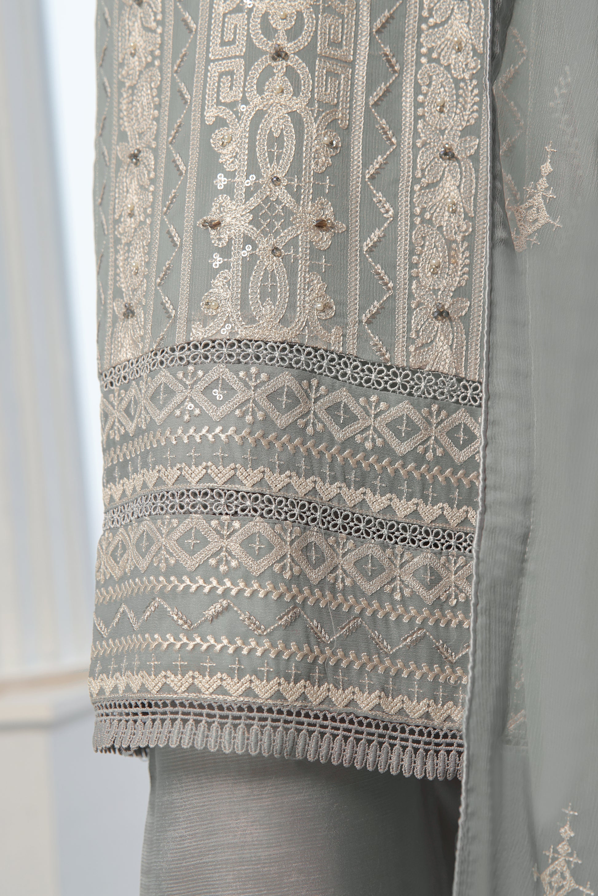 Dupatta: Embroidered Chiffon with 4-side Silk Dori Piping.