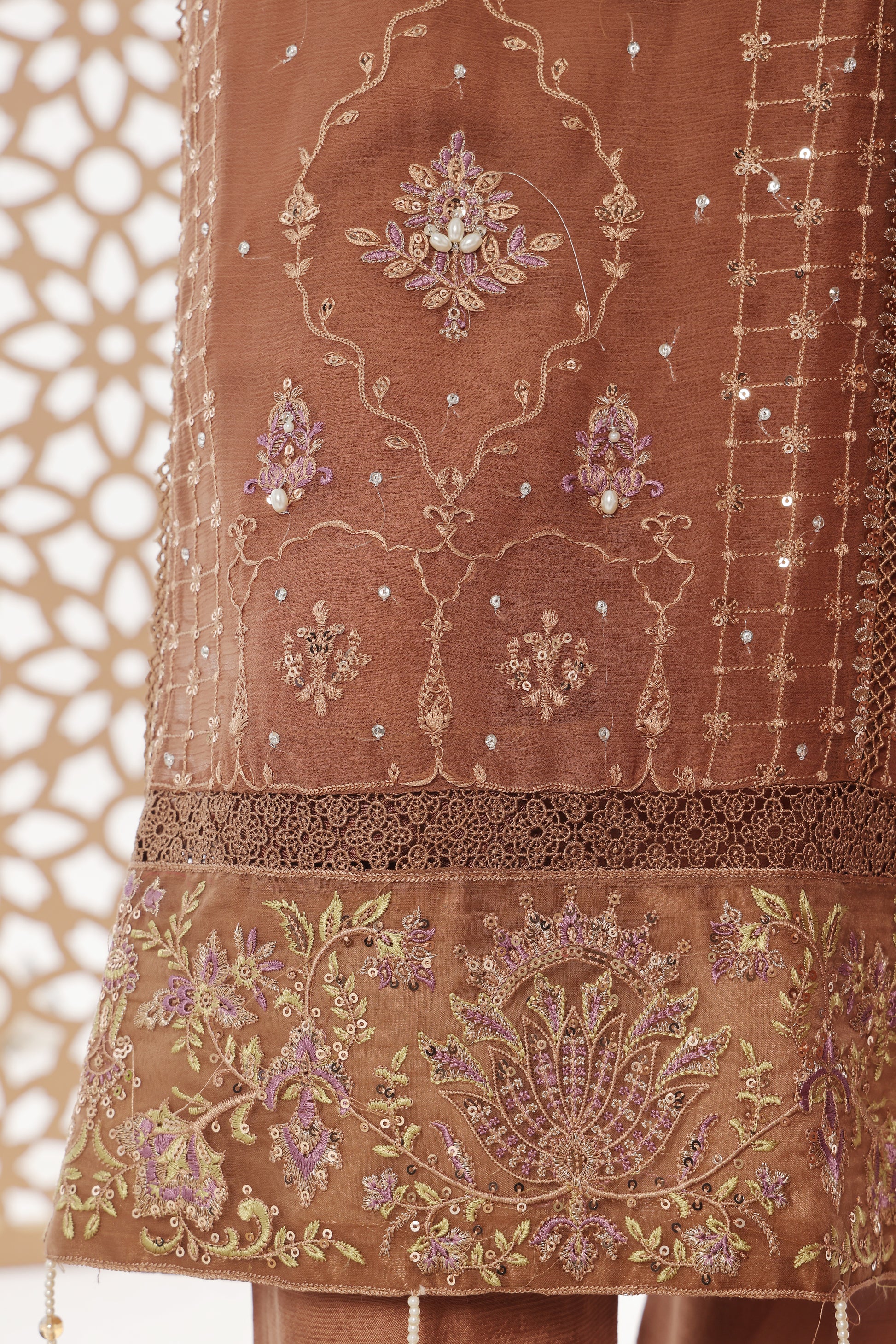 Shirt Chiffon Semi Stitched, handwork or laces, embroidered back with lace work, embroidered sleeves with laces.